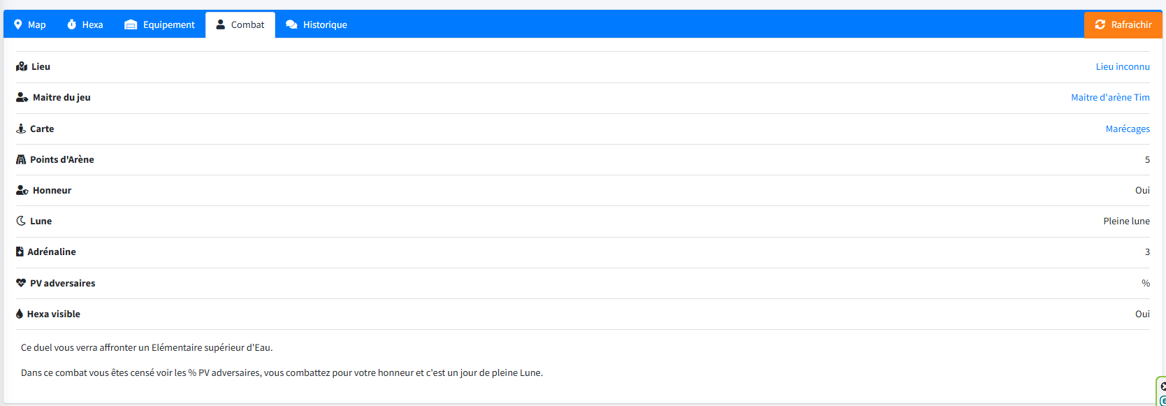 Dans cet onglet sont présentés les différentes caractéristiques du combat. Attention selon certains combat ces informations peuvent être cachés.